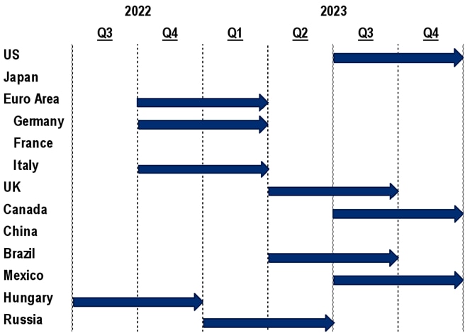 The economists continue to expect rolling country-level recessions in major economies, including the euro area in the first half of the year and the U.S. in the second half, with both China and Japan seen as likely to weather the slowdown relatively well.