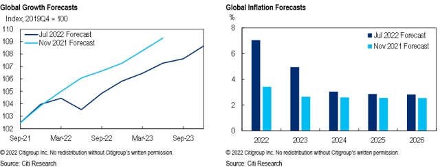 Pulling together these developments, the current forecast envisions global growth of 2.9% this year and 2.5% next year. These projections have been reduced by 0.1 percentage point in 2022 and 0.3 percentage point in 2023. Excluding the stimulus-related mark-ups in China, the projections for global growth next year are down by 0.6 percentage point, including a sharp 0.8 percentage-point cut for developed-market economies. In sum, since the end of last year, Citi Research economics has reduced its 2022 and 2023 global growth forecasts by 1.3 and 0.7 percentage points, respectively. At the same time, it has raised its inflation forecasts by 3.6 and 2.3 percentage points, respectively.