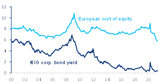| European cost of equity vs € IG corp bond yield, % | Spread differences between broad rating buckets, bp |