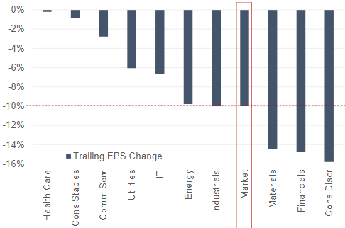 How would the 10% EPS contraction that Citi Research expects impact various European sectors? The strategists examined that question using a regression framework drawing on the last 13 years of historical data and concluded that materials, financials and consumer discretionary sectors might see earnings contractions of between 14 and 16%, with health care and consumer staples sectors likely holding up better.