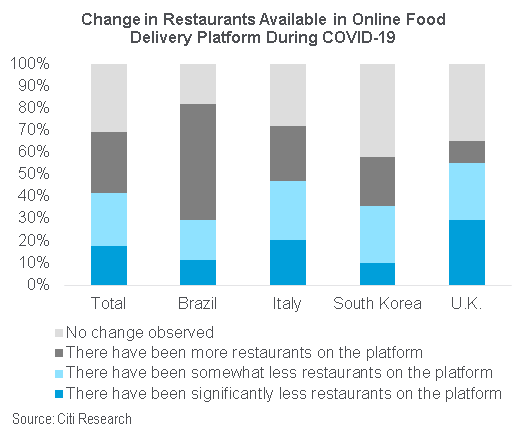 Between April 8 and April 20, we conducted an online food delivery survey among 3,606 consumers (both users of online delivery services and non-users) in the U.K., Italy, Brazil, and South Korea. The average age of users in the survey is 45 with heavier users of the platform younger than light users. Based on data from the results, we analyzed online food delivery platform usage, how it has changed given the COVID-10 pandemic and whether current changes could be long-lasting. Overall, COVID-19 has had a net positive impact on frequency and spending on online food delivery and the majority of new users (57%) are likely to use it again.
