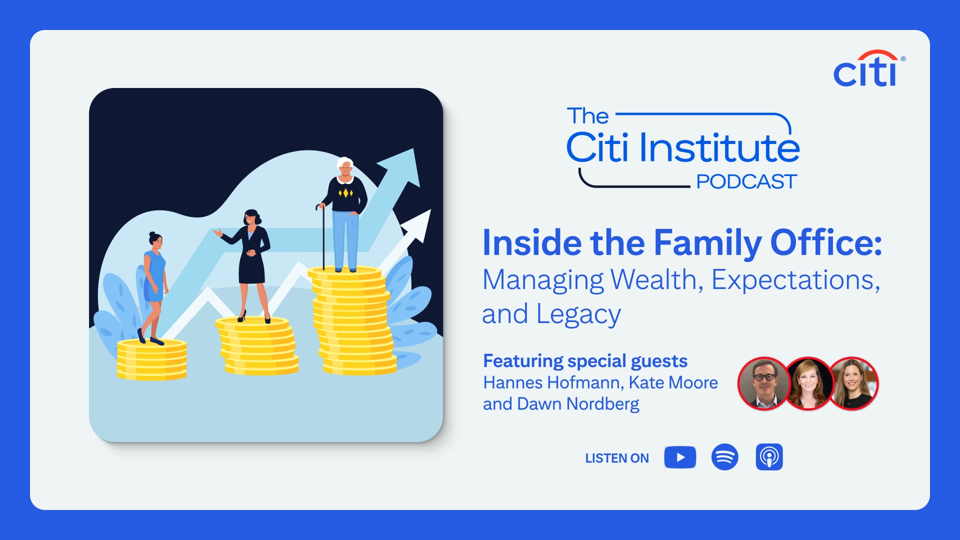 In series 2, episode 1 of the Citi Institute podcast, host Alex Miller is joined by Citi Wealth’s Hannes Hofmann, Head of the Global Family Office Group; Kate Moore, Chief Investment Officer; and Dawn Nordberg, Head of Integrated Client Engagement. Together they discuss the 2025 Global Family Office Report and explore tailored investment approaches, succession planning, family legacy and expectations, and the preservation of generational wealth in this complex and growing segment.