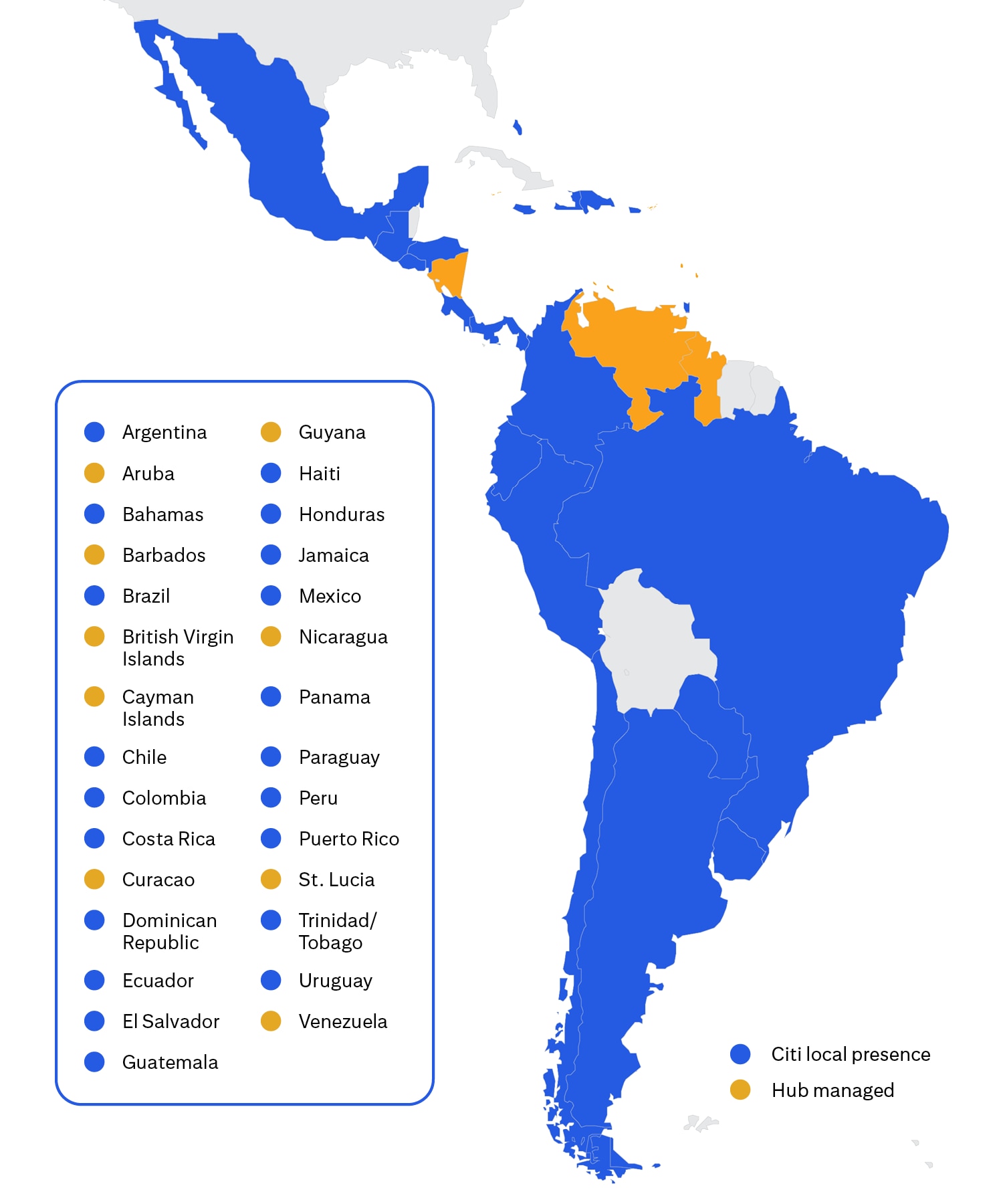 Citi is fully committed to Latin America and is a global bank with an unmatched local presence in the region and a 110 year history of operations. As companies around the world explore Latin America’s opportunities, Citi’s expertise and experience makes it an ideal bank to provide the support you need to make progress.