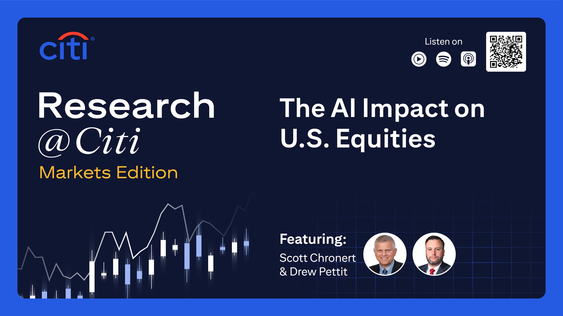 In the latest Research @ Citi Markets Edition podcast, Head of U.S. Equity Strategy Scott Chronert sits down with Drew Pettit, U.S. Equity Strategy, to look at AI’s impact on U.S. equities. They consider that in terms of three components: the stock market vs. the economy, AI in the market, and finally AI’s impact on the market.