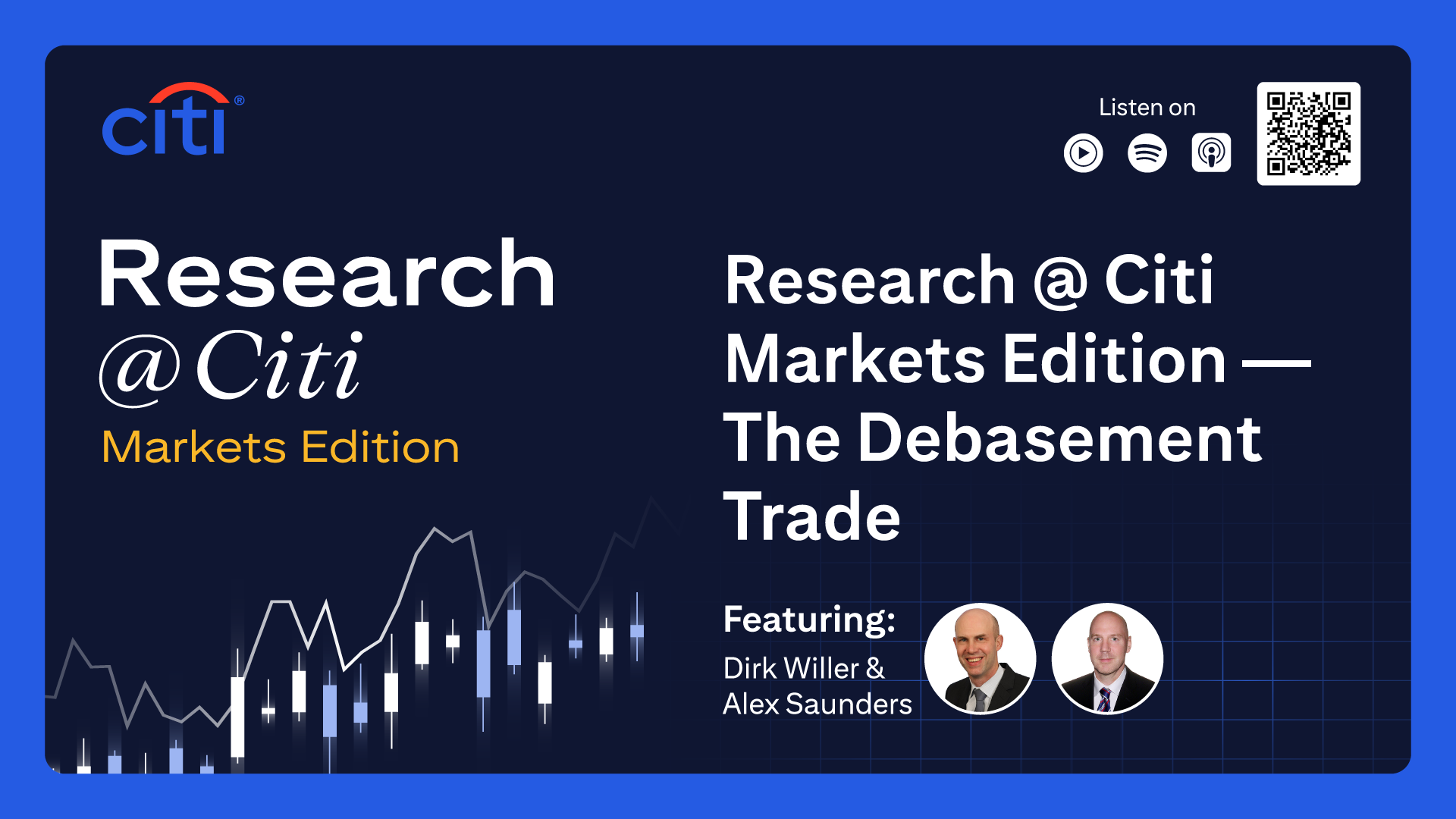 Dirk Willer, Citi’s Global Head of Macro Strategy and Asset Allocation, and Alex Saunders, Citi’s Head of Global Quant Macro Strategy, consider the debasement trade. The debasement trade is based on the fear that fiat currencies could be debased by aggressive fiscal and/or monetary policy, and has manifested in a relentless rally in gold. Dirk and Alex explore aspects of this phenomenon and offer advice for investors.