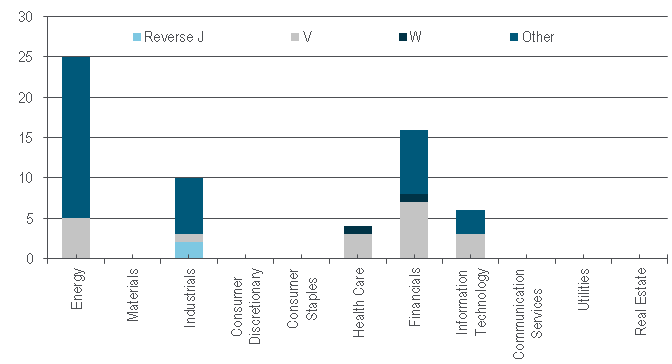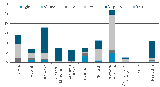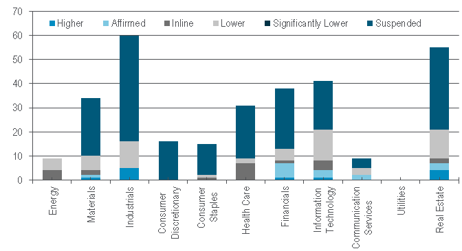 There was a clear cyclical company aspect to pulling their 2020 guidance, with 44 of 60 Industrials management teams doing so and the same could be seen at 24 of the 34 Materials companies. While 11 Industrials names lowered full-year earnings predictions as well, five surprisingly raised them as did four Real Estate firms. In this context, 83 of the 152 entities that foresaw a U-shaped GDP pattern were also comprised of Energy, Materials and Industrials companies.