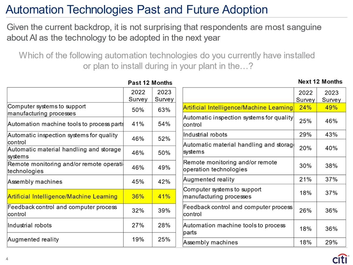 The backdrop to this survey is that Citi Research analysts reckon spending on automation has accelerated in the post-COVID era as companies try to better manage supply chain dynamics, and buttress manufacturing efficiency and productivity in a tighter labor market. They also say accelerated investment in domestic manufacturing is a still-emerging trend that could support growth in automation end markets.