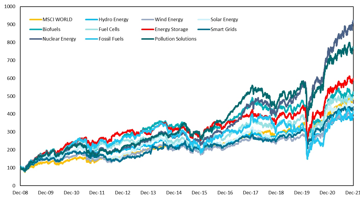 Cumulative returns since 2009 show that energy storage has outperformed MSCI World as well as seven of its peer themes that belong to the Energy Environment meta-theme |
