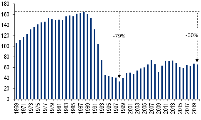 Apparent consumption paints an even worse picture. Apparent consumption fell to 33 million tonnes in 1998, almost 80% lower than the 164 million tonnes peak in 1988. Even after the recovery to 65 million tonnes over the last few years, it is still 60% below the peak levels of 1988.