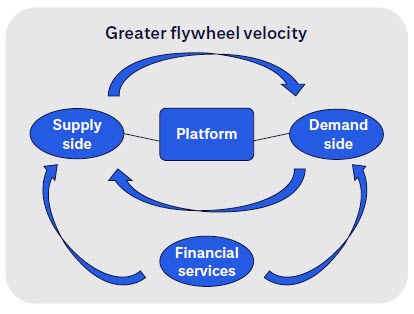Evidence supports the notion that adding financial services to a platform makes the flywheel run faster. This paper suggests a new strategy for the integration of financial service into marketplaces and platforms through the creation of ‘three-sided markets’. It suggests that platforms might provide standardized contracts and APIs that enable financial services to be onboarded onto platforms as readily as buyers and suppliers. The result is a synthesis of trust-based services provided by the platform itself and the participating financial institutions, leading to new network effects and an acceleration of the economic flywheel.