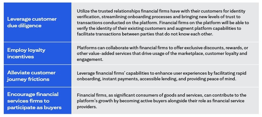 Platforms can switch mindset and begin to consider financial firms as a new class of marketplace participant, equal in importance to producers and consumers. Financial services providers must be considered integral components of the ecosystem to stimulate three-sided network effects. Practical steps are outlined below: