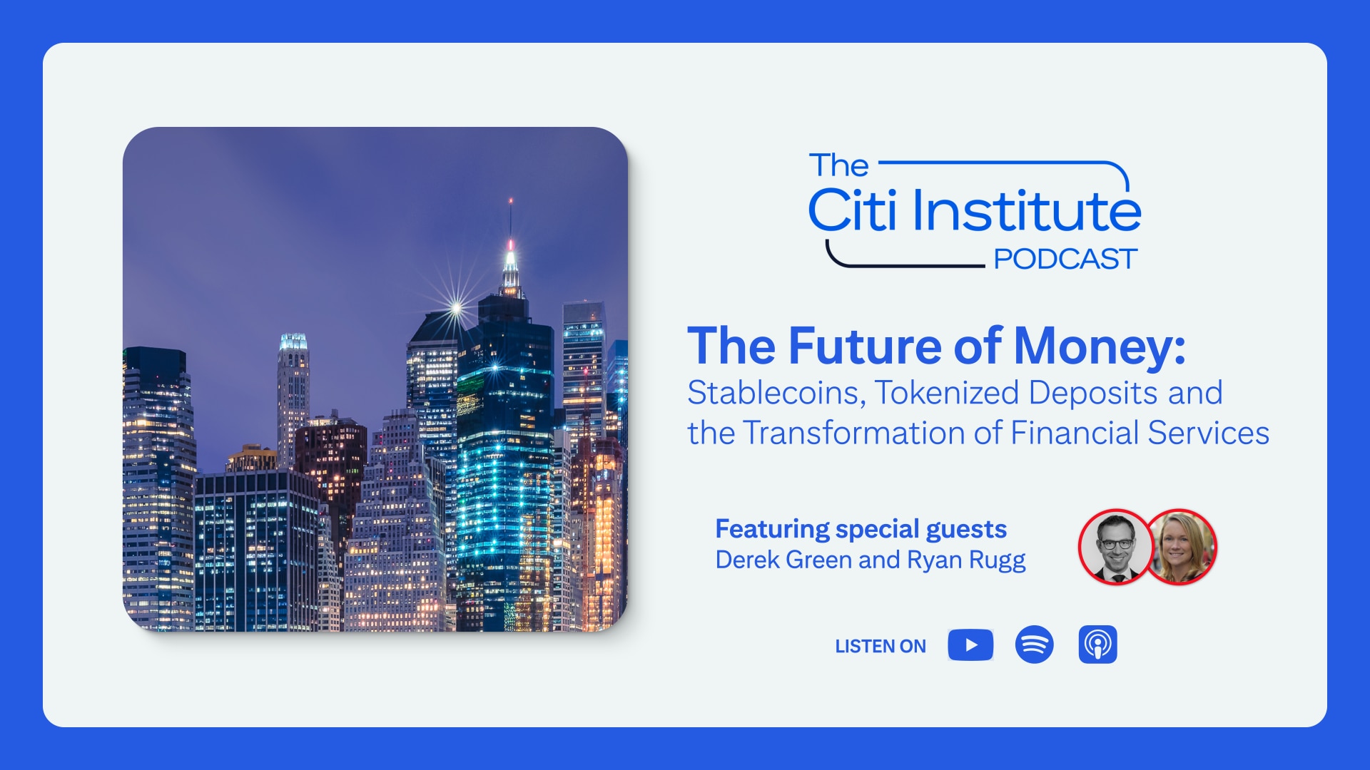 In this episode of the Citi Institute podcast, host Ronit Ghose is joined by Citi’s Ryan Rugg, Head of Digital Assets, Treasury and Trade Solutions, and Derek Green, Treasurer and Global Head of Banking Operations, Payoneer. Together they discuss the evolution of digital assets, stablecoins, and tokenized deposits, and the implications for the future of finance and banking.