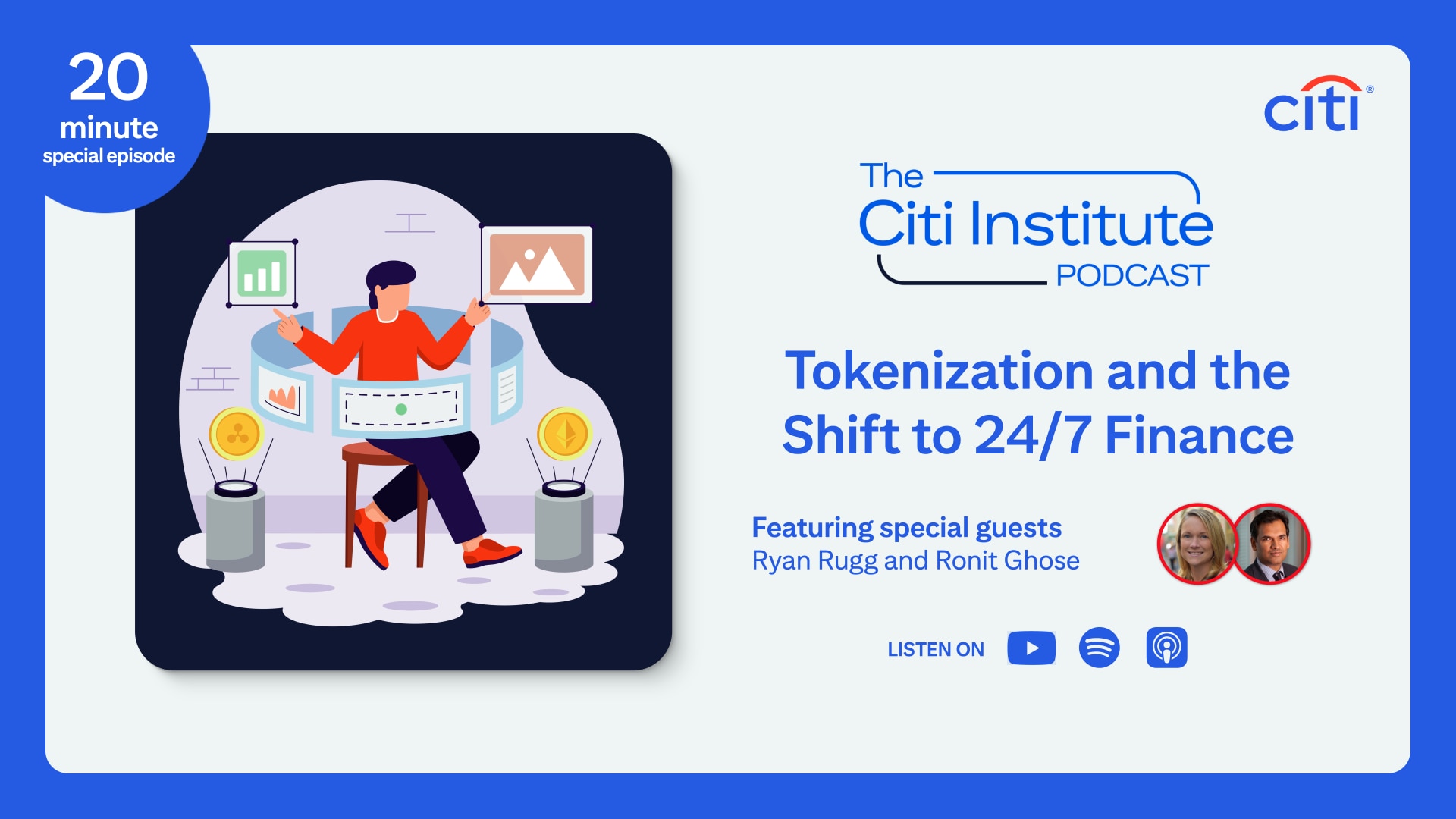 In this special episode of the Citi Institute podcast, host Ronit Ghose is joined by Ryan Rugg, Head of Digital Assets for Treasury and Trade Solutions, Citi to discuss the possibilities and challenges that come with Tokenization, and to share their insights on 24/7 Finance and what it might mean for industries and society as a whole.