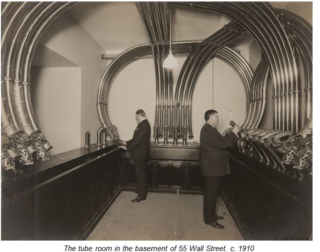 Among the innovations was a system for transmitting messages via a network of pneumatic tubes. The tube room was in the basement of 55 Wall Street and could handle up to 1,100 messages a day. Six years later, the bank installed a new pneumatic system that could send 12,000 cartridges a day. As more and more office machinery was being used, the bank set up a machinery repair department with six repairmen. It was initially responsible for more than 600 typewriters, 200 adding machines, and 200 Dictaphones. Once regarded as a toy, the Dictaphone played an important role by the early 1920s, with about 30 Dictaphone operators working in the stenographic department.