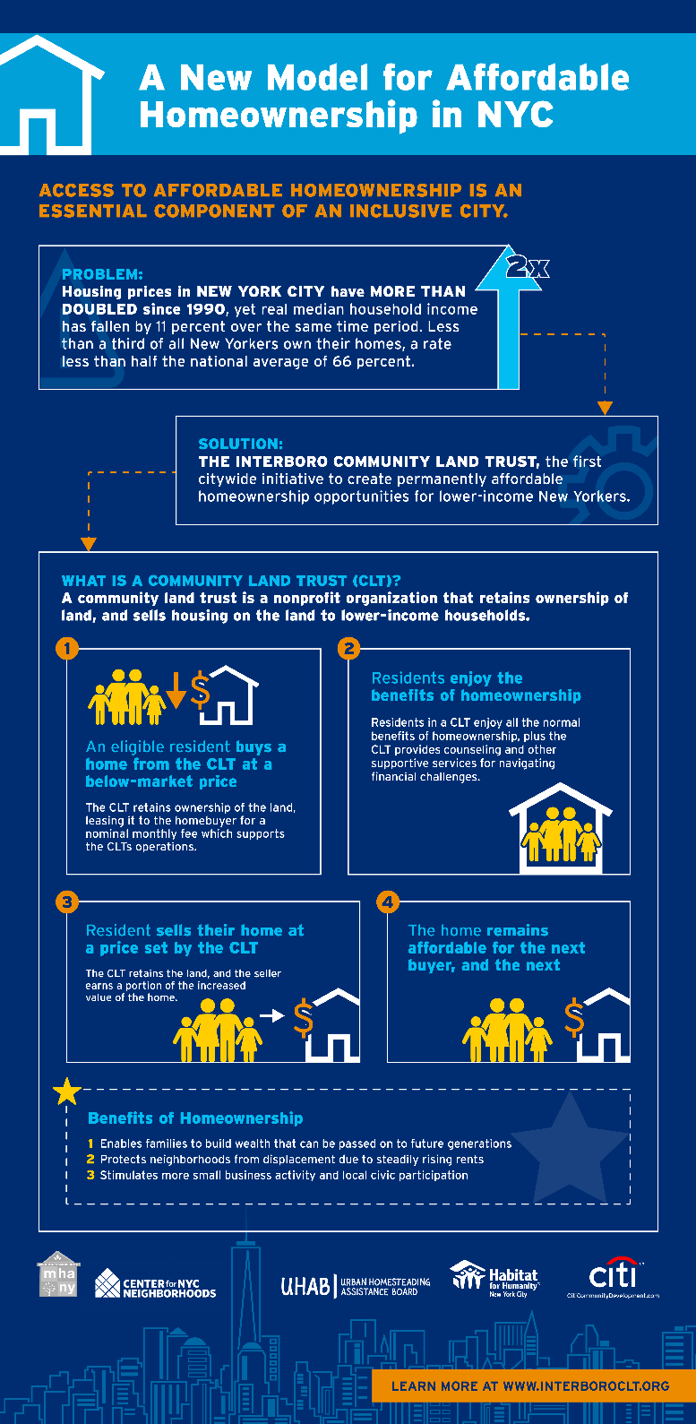 In October 2017, the Center for NYC Neighborhoods, Habitat for Humanity New York City, the Mutual Housing Association of New York (MHANY), the Urban Homesteading Assistance Board (UHAB), and Citi Community Development announced the launch of the Interboro Community Land Trust -- the first citywide community land trust designed to create permanently affordable homeownership opportunities for low-income New Yorkers.