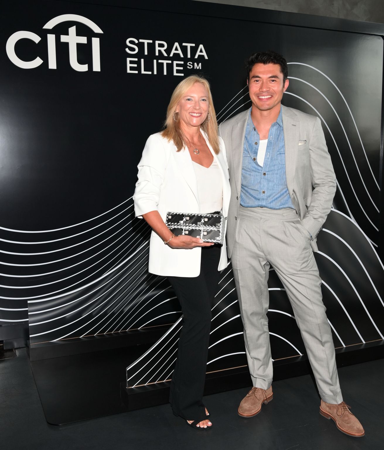 Pam Habner, Head of Branded Cards, poses with Henry Golding, actor and Citi Strata Elite℠ spokesperson, along with a purse made of Citi Strata Elite℠ credit cards.