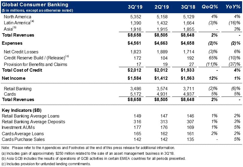 Citigroup cost of credit of $2.1 billion in the third quarter 2019 increased 6%, primarily driven by volume growth and seasoning in Citi-Branded Cards and Citi Retail Services in North America GCB.