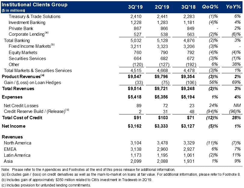New York – Citigroup Inc. today reported net income for the third quarter 2019 of $4.9 billion, or $2.07 per diluted share, on revenues of $18.6 billion. This compared to net income of $4.6 billion, or $1.73 per diluted share, on revenues of $18.4 billion for the third quarter 2018.