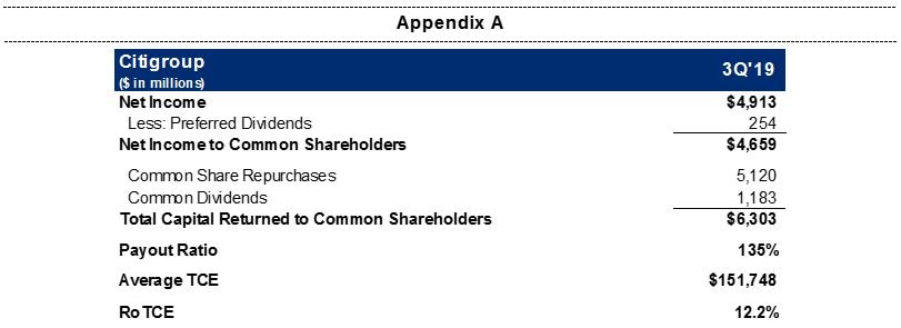 4 Citigroup's payout ratio is the sum of common dividends and common share repurchases divided by net income available to common shareholders. For the components of the calculation, see Appendix A.