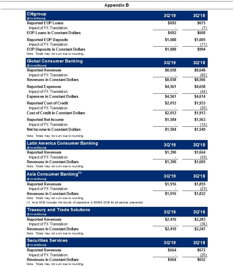 Additional financial, statistical, and business-related information, as well as business and segment trends, is included in a Quarterly Financial Data Supplement. Both this earnings release and Citigroup's Third Quarter 2019 Quarterly Financial Data Supplement are available on Citigroup's website at www.citigroup.com.