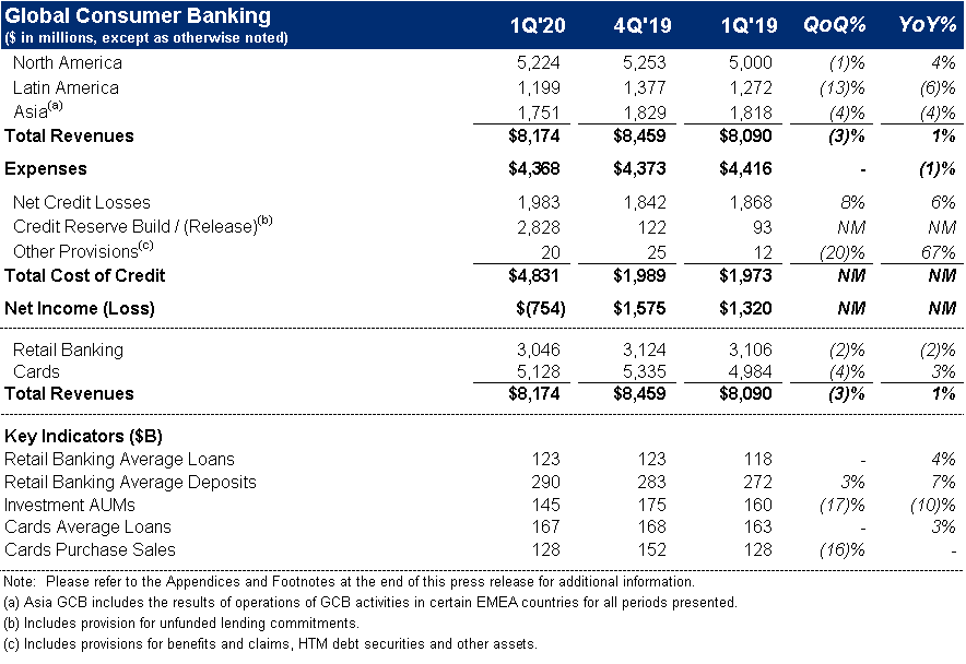 Citigroup cost of credit of $7.0 billion in the first quarter 2020 compared to $2.0 billion in the prior-year period, reflecting the loan loss reserve builds related to the impact of changes in Citi's economic outlook on estimated lifetime losses under the CECL standard.