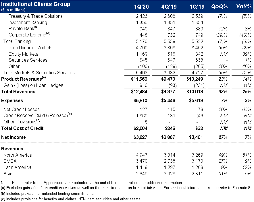 8 Credit derivatives are used to economically hedge a portion of the private bank and corporate loan portfolio that includes both accrual loans and loans at fair value. Gains / (losses) on loan hedges includes the mark-to-market on the credit derivatives and the mark-to-market on the loans in the portfolio that are at fair value. In the first quarter 2020, gains / (losses) on loan hedges included $754 million related to Corporate Lending and $62 million related to the Private Bank, compared to losses of $231 million related to Corporate Lending in the prior-year period. The fixed premium costs of these hedges are netted against the Private Bank and Corporate Lending revenues to reflect the cost of credit protection. Citigroup's results of operations excluding the impact of gains / (losses) on loan hedges are non-GAAP financial measures.