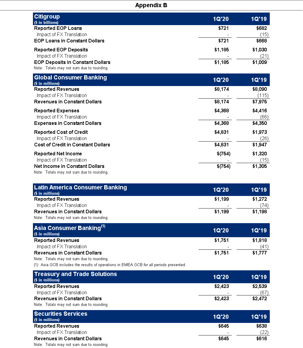 Additional financial, statistical and business-related information, as well as business and segment trends, is included in a Quarterly Financial Data Supplement. Both this earnings release and Citigroup's First Quarter 2020 Quarterly Financial Data Supplement are available on Citigroup's website at www.citigroup.com.