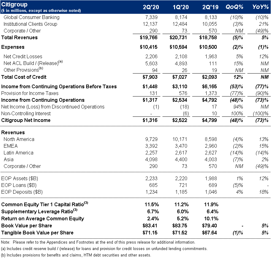 New York – Citigroup Inc. today reported net income for the second quarter 2020 of $1.3 billion, or $0.50 per diluted share, on revenues of $19.8 billion. This compared to net income of $4.8 billion, or $1.95 per diluted share, on revenues of $18.8 billion for the second quarter 2019.