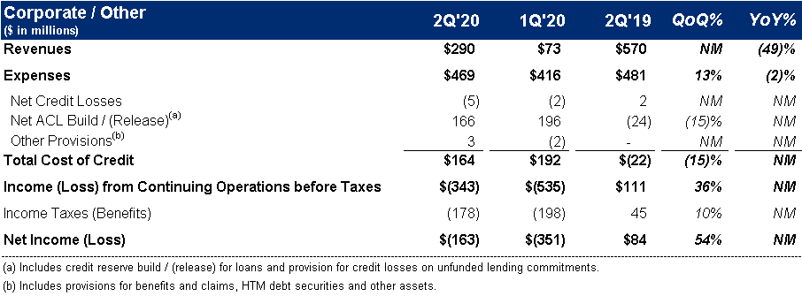 Corporate / Other loss from continuing operations before taxes of $(343) million compared to income of $111 million in the prior-year period, driven by higher ACL builds on our legacy portfolio, and the lower revenues, partially offset by the decrease in expenses.
