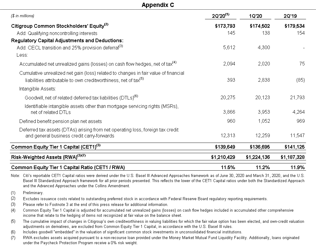 3 Ratios as of June 30, 2020 are preliminary. Commencing January 1, 2020, Citigroup's Common Equity Tier 1 (CET1) Capital ratio and Supplementary Leverage Ratio (SLR) reflect certain deferrals based on the modified regulatory capital transition provision related to the Current Expected Credit Loss (CECL) standard. Excluding the deferrals based on the modified CECL transition provision, Citigroup's CET1 Capital ratio and SLR as of June 30, 2020 would be 11.1% and 6.4%, respectively, on a fully reflected basis.