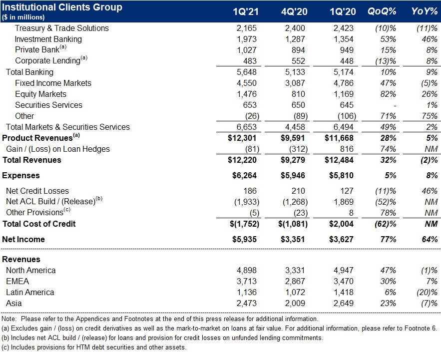 "We reported record net income driven by strong performance in our Institutional Clients Group and a significant release from our Allowance for Credit Losses, as a result of the improving economic outlook. While Global Consumer Banking revenues were down quarter-over-quarter as a result of the pandemic, this is the healthiest we have seen the consumer emerge from a crisis in recent history.