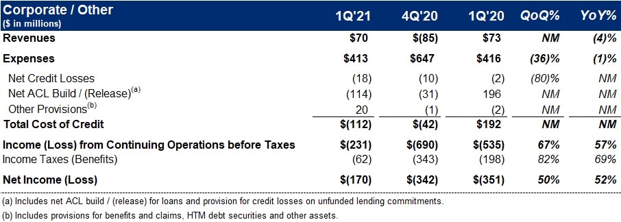 Corporate / Other loss from continuing operations before taxes of $231 million compared to a loss of $535 million in the prior-year period, driven by a net ACL release on the legacy portfolio versus a build in the prior-year period.