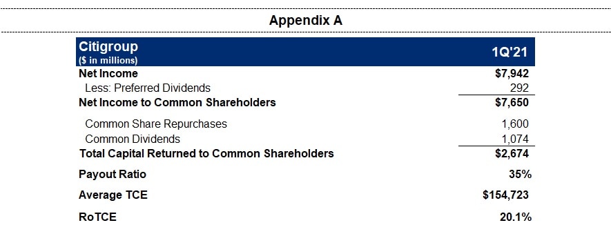 3 Citigroup's payout ratio is the sum of common dividends and common share repurchases divided by net income available to common shareholders. For the components of the calculation, see Appendix A.