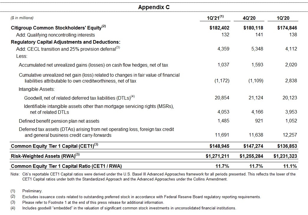 1 Ratios as of March 31, 2021 are preliminary. Commencing January 1, 2020, Citigroup's Common Equity Tier 1 (CET1) Capital ratio and Supplementary Leverage ratio (SLR) reflect certain deferrals based on the modified regulatory capital transition provision related to the Current Expected Credit Loss (CECL) standard. Excluding the deferrals based on the modified CECL transition provision, Citigroup's CET1 Capital ratio and SLR as of March 31, 2021 would be 11.4% and 6.8%, respectively, on a fully reflected basis. For additional information, please refer to the "Capital Resources" section of Citigroup's 2020 Form 10-K.