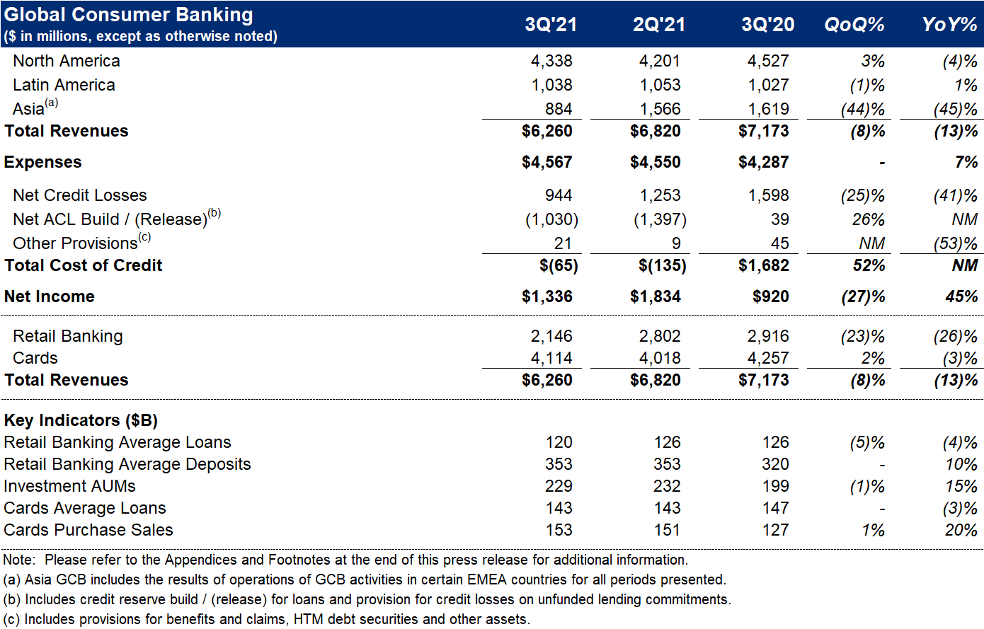 Citigroup cost of credit of $(0.2) billion in the third quarter 2021 compared to $2.4 billion in the prior-year period, reflecting a release of allowance for credit loss (ACL) reserves and an improvement in net credit losses, driven by continued improvement in portfolio credit quality.