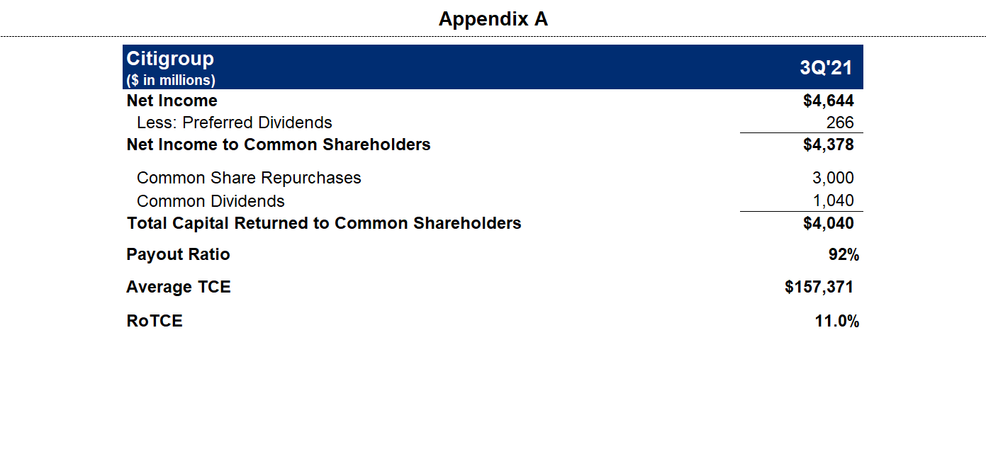 3 Citigroup's payout ratio is the sum of common dividends and common share repurchases divided by net income available to common shareholders. For the components of the calculation, see Appendix A.