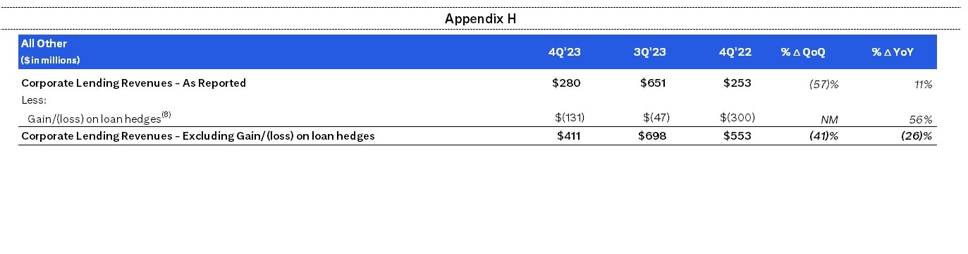 (8) Credit derivatives are used to economically hedge a portion of the Corporate Lending portfolio that includes both accrual loans and loans at fair value. Gain / (loss) on loan hedges includes the mark-to-market on the credit derivatives and the mark-to-market on the loans in the portfolio that are at fair value. In the fourth quarter 2023, gain / (loss) on loan hedges included $(131) million related to Corporate Lending, compared to $(300) million in the prior-year period. The fixed premium costs of these hedges are netted against the Corporate Lending revenues to reflect the cost of credit protection. Citigroup’s results of operations excluding the impact of gain / (loss) on loan hedges are non-GAAP financial measures. For a reconciliation to reported results, please refer to Appendix H.