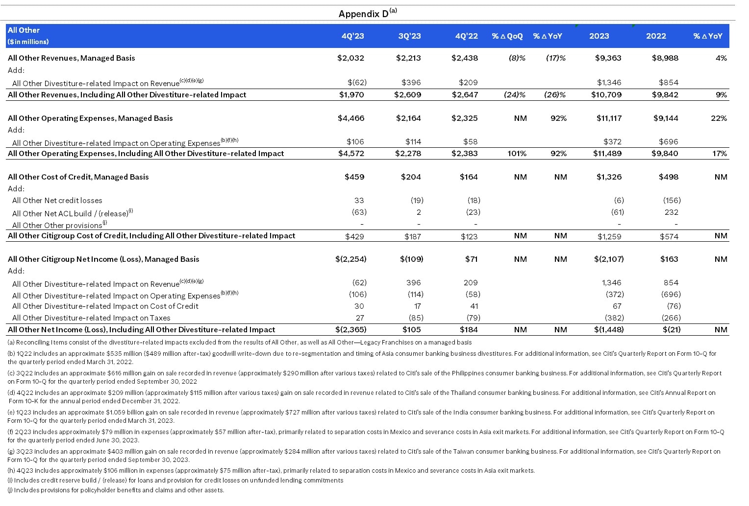 (10) All Other (Managed Basis) reflects results on a managed basis, which excludes divestiture-related impacts, for all periods, related to Citi’s divestitures of its Asia consumer banking businesses and the planned divestiture of Mexico consumer banking and small business and middle market banking within Legacy Franchises. Certain of the results of operations of All Other (Managed Basis) and Legacy Franchises (Managed Basis) that exclude divestiture-related impacts are non-GAAP financial measures. Citi believes the presentation of its results of operations excluding these divestiture-related impacts provide a meaningful depiction of the underlying fundamentals of its All Other (Managed Basis) and Legacy Franchises (Managed Basis) results for investors, industry analysts and others, including increased transparency and clarity into operating results, improved visibility into management decisions and their impacts on operational performance; enables better comparison to peer companies; and allows Citi to provide a long-term strategic view of the category going forward. In addition, Citi’s Chief Operating Decision Maker, or its Chief Executive Officer, regularly reviews financial information on a managed basis that excludes these divestiture-related impacts. For additional information and a reconciliation of these results, please refer to Appendix D.