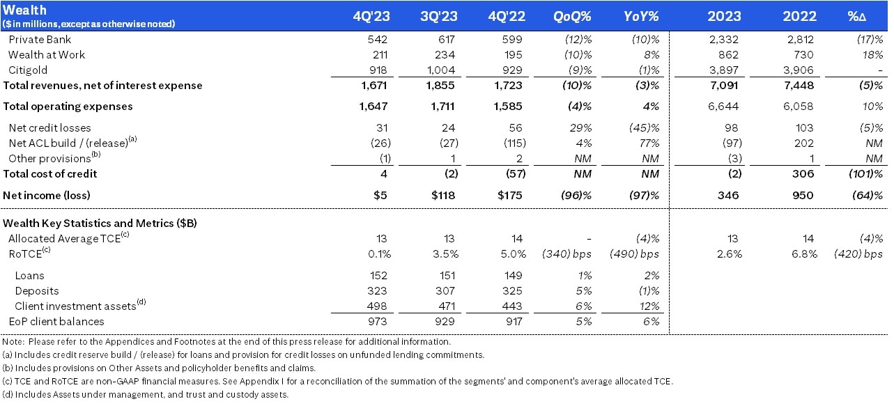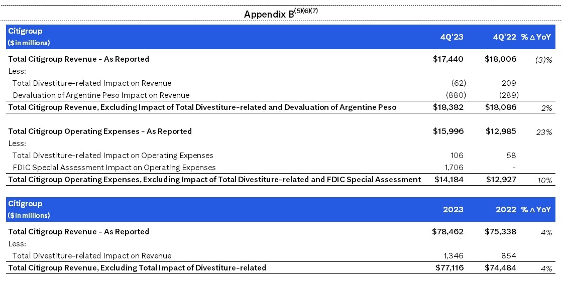 (5) For additional information on the notable items, see Citi’s Current Report on Form 8-K filed on January 10, 2024 with the U.S. Securities and Exchange Commission. Results of operations excluding the impact of these notable items are non-GAAP financial measures.  Citi believes the presentation of its results of operations and financial condition excluding the impacts of these notable items provides a meaningful depiction of the underlying fundamentals of its broader results for investors, industry analysts and others.  For a reconciliation to reported results, please refer to Appendix B and C. For a reconciliation to reported EPS, refer to appendix J.