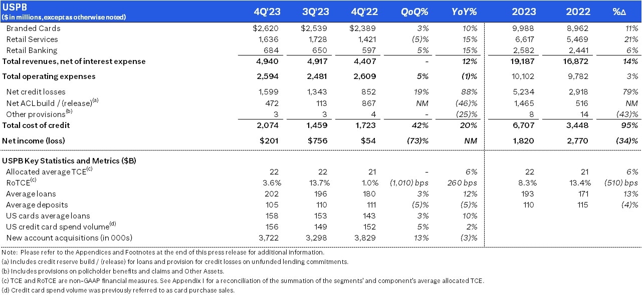 USPB revenues of $4.9 billion increased 12%, driven by higher net interest income due to loan growth in cards and higher deposit spreads.