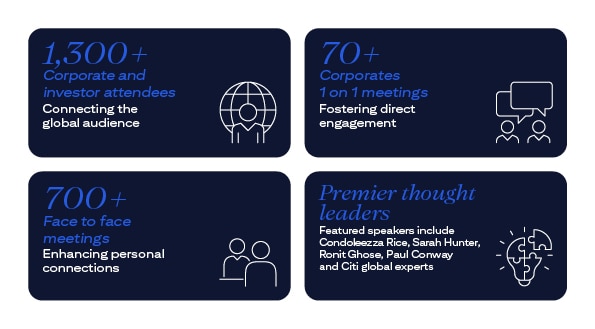 This infographic highlights key features of the Citi Australia and New Zealand Investment Conference 2025. It uses icons and large numbers to convey information effectively.